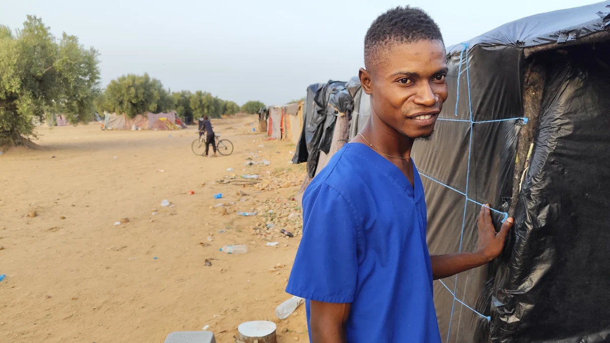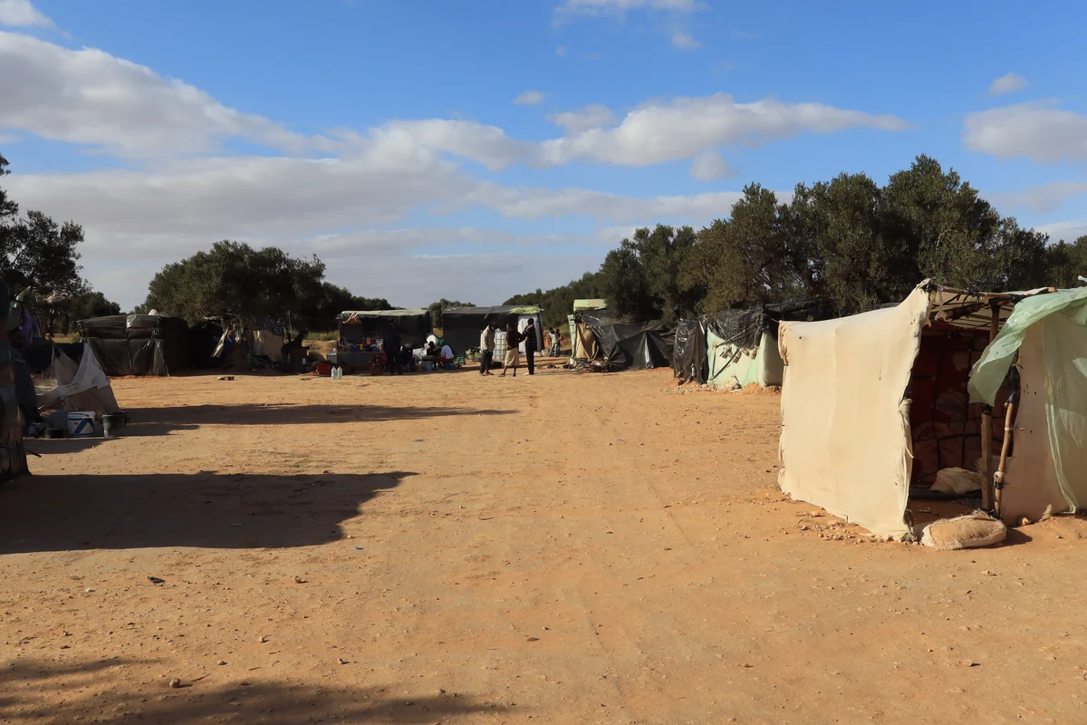 In seiner Feldklinik im „Kilometer 35“ behandelt Foufana Verletzte und Kranke aus den insgesamt 17 Camps, die über 50 Kilometer verstreut liegen. Sie werden nach ihrer Entfernung von Sfax benannt und sind meist nach Nationen getrennt. Seit zwei Jahren, seit der Vertreibung aus Sfax stehen sie nun hier – und sehen aus wie gerade gebaut. Denn immer wieder rücken Beamte an und zerstören die Zelte. Auch die „Klinik“ ist im Wesentlichen ein unscheinbares, aus Holzlatten und Plastikfolie zusammengebautes Zelt.