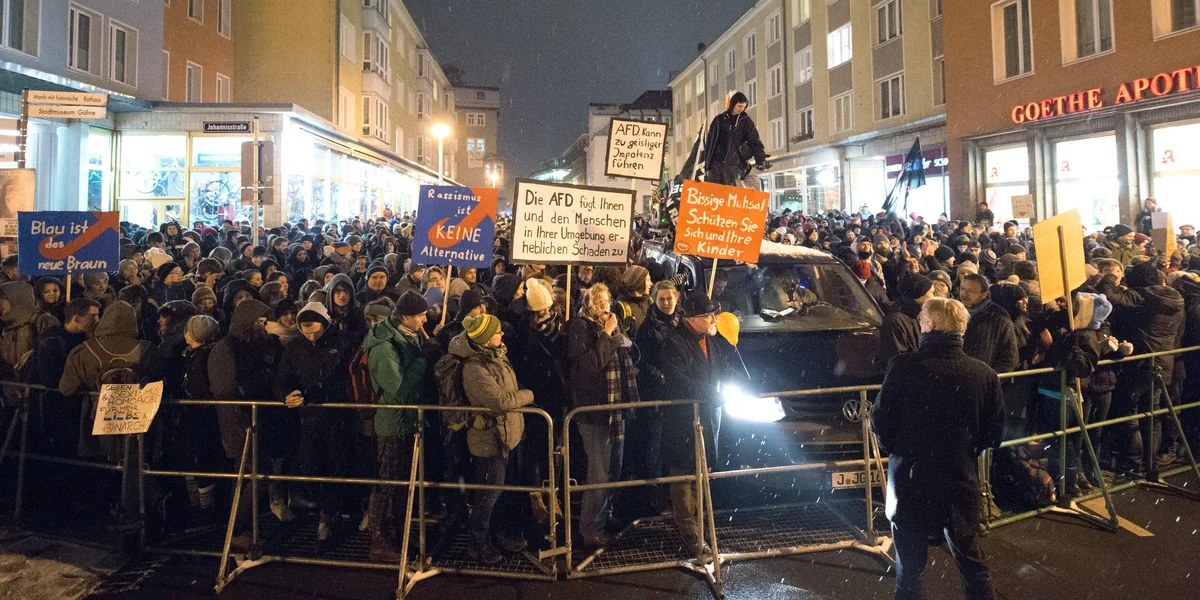 dpa | Gegen eine Kundgebung der rechtskonservativen Alternative für Deutschland (AfD) haben am Mittwochabend in Jena laut Polizei rund 1.500 Menschen demonstriert. Sie verhinderten damit einen ursprünglich geplanten AfD-Demonstrationszug durch Jena.