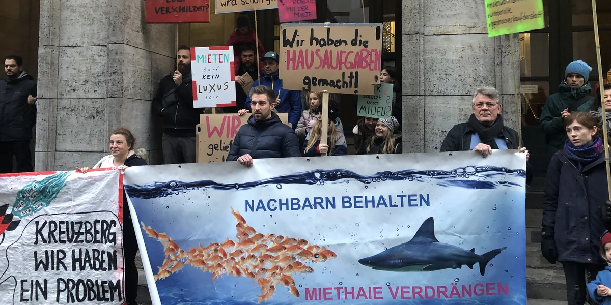 „Wegen Euch verschuldet“ oder „Hausaufgaben gemacht“: Kleine Transparente wie diese haben Mieterinnen und Mieter, meistens Familien mit Kindern, am Sonntag bei einer Kundgebung vor der Berliner Finanzverwaltung mitgebracht. Die etwa 60 DemonstrantInnen gehörten zu den mehr als 200 MieterInnen aus sechs Häusern in Friedrichshain, Kreuzberg und Schöneberg, die seit Wochen um ihre Zukunft bangen. Die Mietshäuser wurden in den vergangenen Monaten über das Vorkaufsrecht von der Genossenschaft „Diese eG“ erworben. Doch bis zuletzt war die Finanzierung der Ankäufe nicht gesichert.
