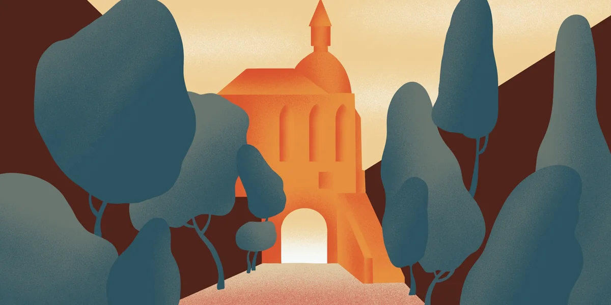 Jenes zeigte eine rot gewandete androgyne Person, die in die Höhe schaut. Umkränzt von einer roséfarbenen Schäfchenwolken-Mandorla schwebte diese Gestalt barfuß im Himmel über den vielen, vielen Türmen Oberwesels und dem Rhein, in der rechten Hand einen Abendmahlskelch, in der linken einen Palmwedel. Puh.