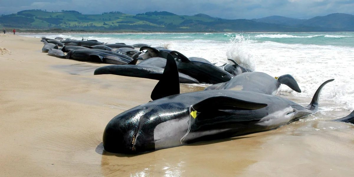 Grindwale können bis zu sechs Meter lang werden und sind die häufigste Walart in neuseeländischen Gewässern. Wissenschaftler rätseln darüber, wieso die Meeressäuger immer wieder in großen Gruppen stranden. Experten beschreiben Farewell Spit wegen des flachen Wassers als Falle für Wale. Das scheine die Wale zu verwirren und ihre Fähigkeit zum Navigieren zu verringern. Es könnte auch sein, dass gesunde Tiere ihren gestrandeten Artgenossen zur Hilfe kommen wollen.