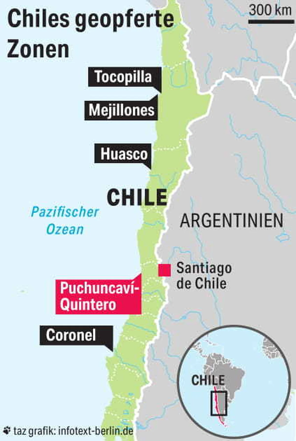 Die chilenische Regierung hat in den sechziger Jahren fünf Gebiete dem industriellen Ausbau überlassen. Puchuncaví-Quintero ist eine sogenannte zona de sacrificio, eine geopferte Zone.