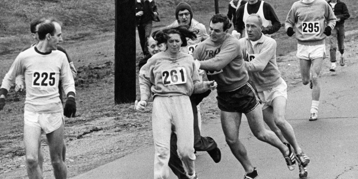Es ist das Jahr des Summer of Love, aber jetzt, Mitte April, ist es noch ungewöhnlich nasskalt in Boston, zu Beginn des Rennens haben die Läufer mit Schneeböen zu kämpfen. Auch K. V. Switzer, registriert mit der Teilnehmernummer 261. Wie viele andere hat Nummer 261 wegen der Witterung Leggings und Sweatshirt nach dem Warmmachen ausnahmsweise nicht abgelegt. Und so dauert es ein paar Kilometer, bis es Journalisten in einem Pressebus auffällt: Nummer 261 ist eine Frau. Amüsiert bis empört informieren sie die Rennleitung. Die ist nur empört.