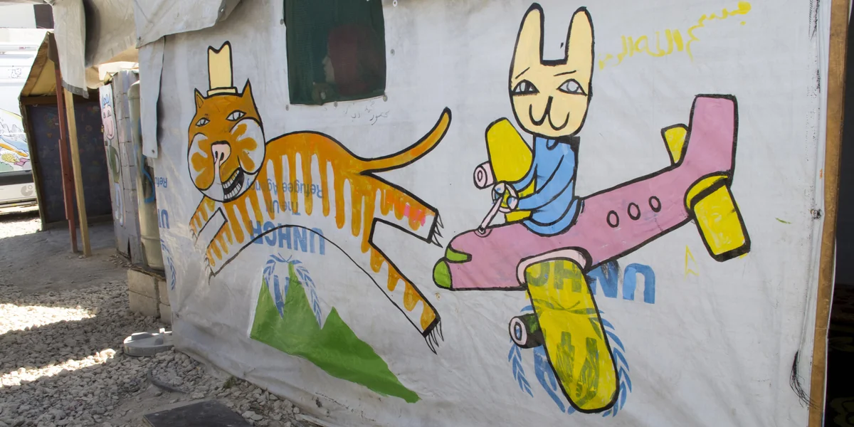 Millionen von Syrern befinden sich seit Ausbruch des Bürgerkriegs 2011 auf der Flucht. Überall um Barelias sind schmale provisorische Zeltstädte errichtet. In Camp Yehya leben 250 Menschen, rund 50 Familien mit 80 Kindern. Die meisten aus Homs und Daraa, seit fünf Jahren sind sie hier. Am Eingang des Camps verströmen offene Müllcontainer einen säuerlichen Geruch. Und es ist sehr staubig. Avignon säubert die hellen Plastikzeltplanen, die er mit den Kindern gleich bemalen will. Fließend Wasser gibt es in Camp Yehya derzeit nicht.