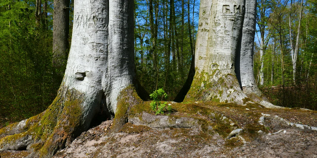 Bei einem Spaziergang durch den Ruheforst werden wir auf einer kleinen Anhöhe fündig. Dort wächst eine stattliche Buche, die zu dieser Jahreszeit so kahl wie der Kopf meines verstorbenen Vaters ist. Ganz in ihrer Nähe stehen zwei kleinere Bäume, die sich fast schon Schutz suchend an sie lehnen. Irgendwie familiär, das Bild, denke ich. Damals bin ich aber noch viel zu aufgewühlt, um die Schönheit dieses Waldes zu erkennen, seine sanften Hügel, die lieblichen Bachläufe zwischen den Bäumen, die Buschwindröschen.