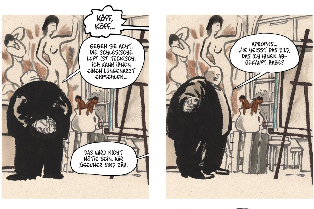 Luz: Auf der einen Seite habe ich einen Künstler gesucht, der nicht zu berühmt war, weder für mich noch die Leser:innen. Bei der Recherche habe ich dann festgestellt, dass mich noch sehr viel mehr mit Otto Mueller verbindet. Dann wollte ich ganz in dieses Universum eintauchen und habe entdeckt, dass Mueller als Kupferstecher arbeitete und wir beide einen sehr scharfen Strich für die Konturen haben. Als ich das Bild „Zwei weibliche Halbakte“ in den Aufnahmen der „Entartete Kunst“-Ausstellung gesehen habe, fragte ich mich, wie das wäre, wenn ein Kind dieses Bild sieht und sich damit auseinandersetzt. Dadurch habe ich wiederum gemerkt, dass ich auch durchaus Fiktion in diese reale Geschichte hineinbringen kann. Auch im historischen Zusammenhang gibt es dunkle Winkel, in die ich hineingehen und die ich mit meiner Fantasie ausfüllen kann. Je präziser meine Recherche für dieses Buch war, desto mehr Freiheit konnte ich mir in diesen dunklen Ecken nehmen.