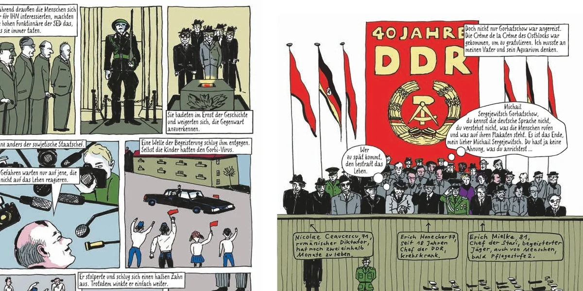 Abgesehen davon ist die Graphic Novel von einer Leichtigkeit geprägt, die die komplexen Ereignisse auf treffende Weise verdichtet und bei jeder Gelegenheit satirisch zuspitzt – wenn etwa vom „Greisenorchester“ um Erich Honecker die Rede ist. Besonders gelungen die Episode mitten in der Nacht der Maueröffnung, wenn sich die „Kamera“ auf die Militärführung in Strausberg richtet, wo die uniformierten Hinterwäldler nichts von den Veränderungen mitbekommen und stattdessen lieber Wildschweine schießen, die ums Haus jagen.