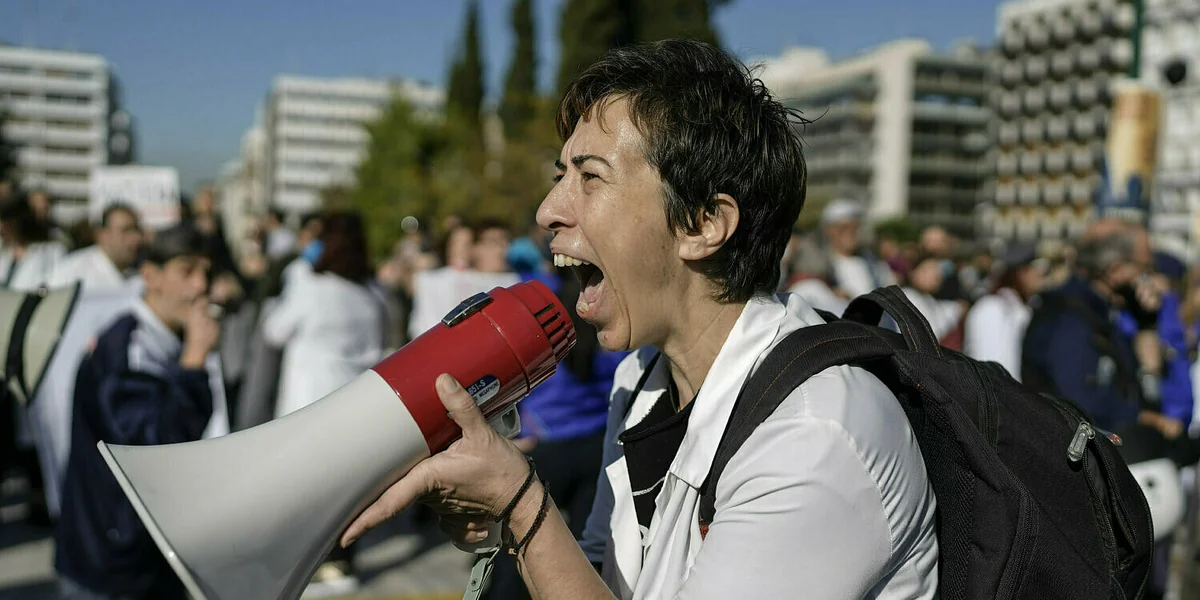 Es fängt allmählich an zu regnen, der Regen wird dann immer heftiger. Wie nach dem Sirtaki-Prinzip. Doch Despina Tsaousidou, 40, bleibt an diesem trüben Morgen im Oktober unbeirrt vor einem schmucken, neoklassizistischen Gebäude im Athener Zentrum stehen. Mit ihr rund 2.000 Demonstranten, die skandieren: „Gestern Helden, heute suspendiert!“ Sie halten Transparente, auf denen Parolen stehen wie „Wir sagen ‚Nein‘ zum Zwang!“ oder „Ohne Freiheit keine Gesundheit“.