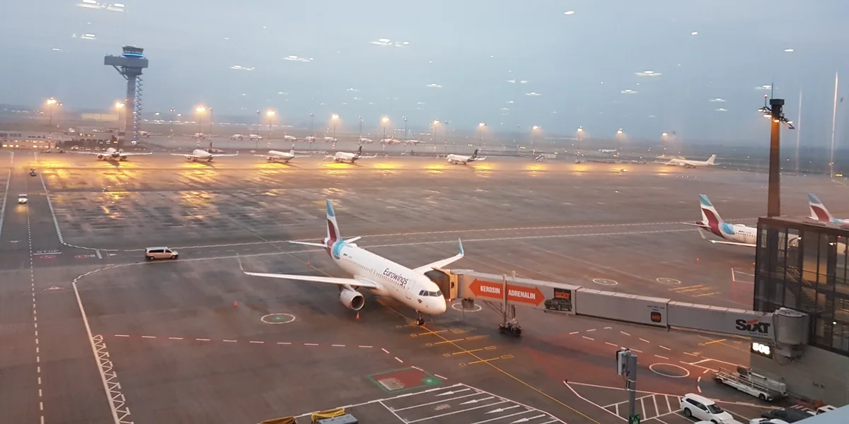 Es dämmert. Der Blick geht nach Westen, bis zum Horizont. Wäre es nicht so grau und diesig, würde man dort jetzt die Sonne untergehen sehen. Zwischen blinkenden Lichtern, Flügel an Flügel sind die Maschinen neben dem Rollfeld aufgereiht. Easy Jet, Lufthansa, Eurowings. Eine einizige, eine portugiesische TAP, schiebt sich langsam Richtung Startbahn. „Berlin in Depression“, sagt eine Frau mit schwäbischem Dialekt, eine der wenigen Besucher an diesem Nachmittag auf der Terrasse. Sie studiere in Berlin und habe sich gedacht: „Was kannst machen bei diesem Wetter? Fährste mal raus.“