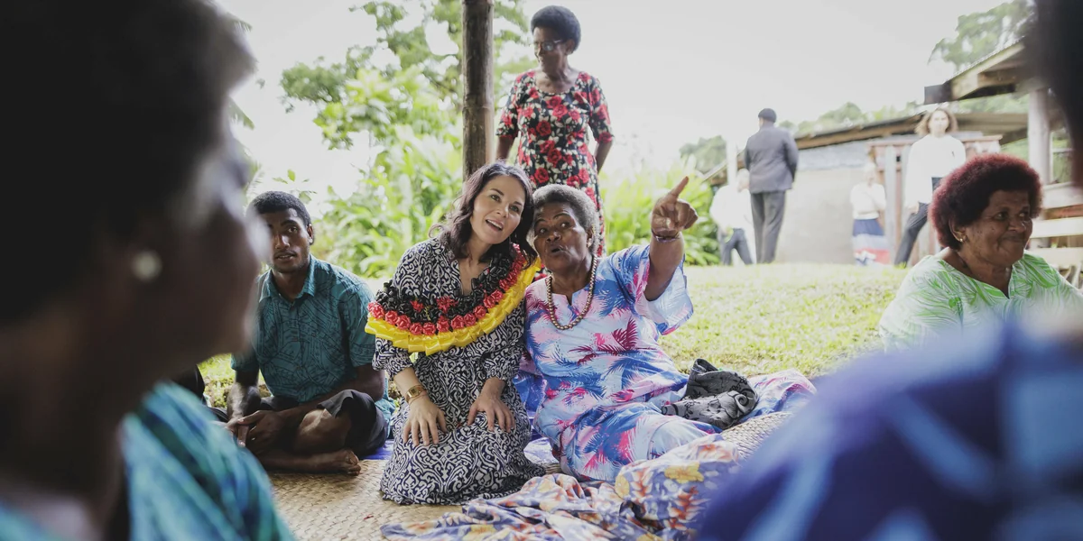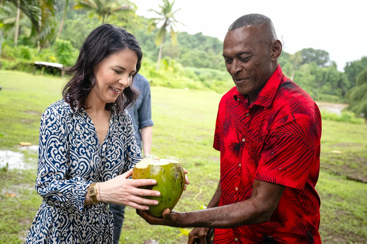 Dieses Signal versucht Baerbock nun auch auf dieser Reise bei jeder Gelegenheit anzubringen. Auch beim Treffen mit den Menschen im bedrohten Dorf Vuniniodrovo, wo nur noch knapp 200 Familien leben. Die Ministerin sitzt im Sommerkleid vor einer Wand mit schwarz-rot-goldenem Stoff im Gemeinschaftshaus. Durch Öffnungen in den Wänden streicht eine kühlende Brise. Auf Bastmatten hocken die Männer des Dorfs im Schneidersitz und begrüßen die mächtige Frau aus Deutschland: Händeklatschen, Gastgeschenke, die Bitte um Einlass ins Dorf, eine Schale mit Kawa – einem leicht betäubenden Trunk aus einer Wurzel. Es ist nicht immer leicht, Außenministerin zu sein.
