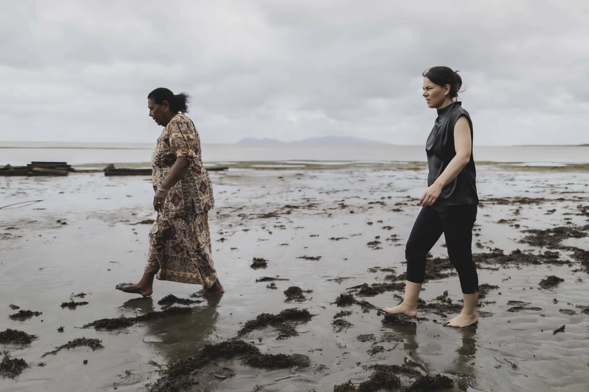 Die deutsche Außenministerin, zuständig auch für internationale Klimapolitik, besichtigt in Fidschi einen Ort, wo die Klimakrise vor der Haustür nicht Halt macht. Mehr Regen im Ostteil der Insel füllt den Fluss mit schlammig-braunem Wasser, ein höherer Meeresspiegel staut den Wasserlauf von der Küste her. Geld für Gegenmaßnahmen haben die Einwohner von Vuniniodrovo nicht. Ihnen bleibt nur der langsame Rückzug, wenn die Strömung an ihren Gärten, Wegen und Häusern nagt. 42 Siedlungen in Fidschi haben bisher einen Antrag auf Umsiedlung gestellt. Die Regierung rechnet damit, dass sie langfristig für ein Fünftel der Bevölkerung, für 200.000 Menschen, neue Siedlungen braucht.