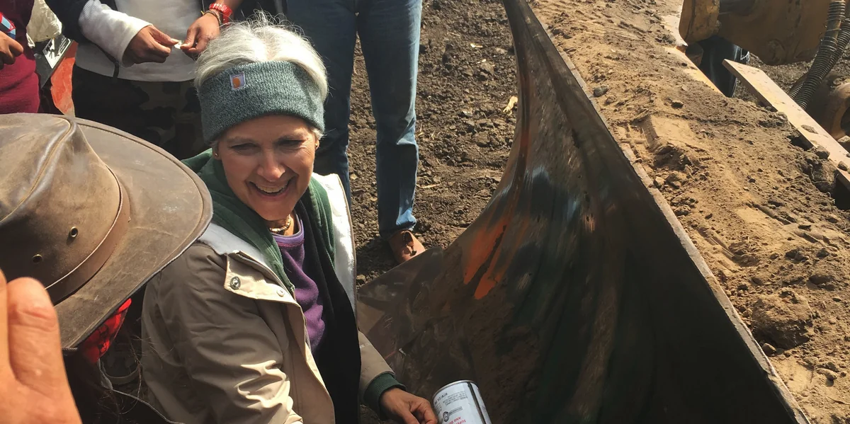 Etwas ungelenk wirkt es, wie die grauhaarige Stirnbandträgerin mit der roten Farbdose herumhantiert. In bedächtigen Abständen zischt es aus der Flasche heraus, als die kniende Frau das Stahlschild des Bulldozers besprüht. Am Ende steht dort: „I approve this message“. Die Frau ist Jill Stein, US-Präsidentschaftskandidatin der Grünen. Jetzt wurde sie angezeigt.