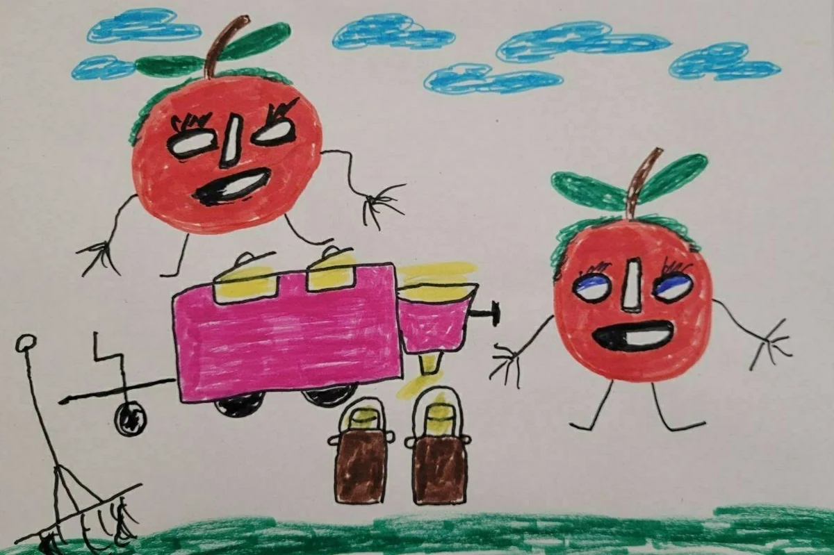 Das Bild zeigt einen Bauernhof mit zwei Äpfeln. Ich war letzte Woche auf der Grünen Woche. Das Bundeslandwirtschaftsministerium hat da jedes Mal einen Stand. Dort haben sie interessante Sachen erzählt. Zum Beispiel, dass sich Bananen verändern, wenn man sie neben Äpfel legt. Sie werden dann dunkel. Das wusste ich gar nicht, das war ganz neu für mich. Und eine Scheibe der Bananen durfte man auch probieren.