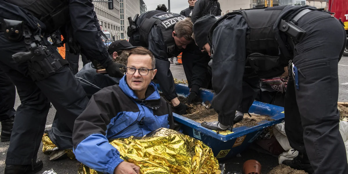 Das Inforadio ist am Dienstagmorgen etwas voreilig: Die Blockade von Extinction Rebellion (XR) am Potsdamer Platz, die am Montagmittag begonnen hatte, sei geräumt, heißt es da um kurz nach neun Uhr. Zu diesem Zeitpunkt sitzen aber noch 13 Blockierer mitten auf der Kreuzung, um sie herum Dutzende Polizisten und eine Absperrung.