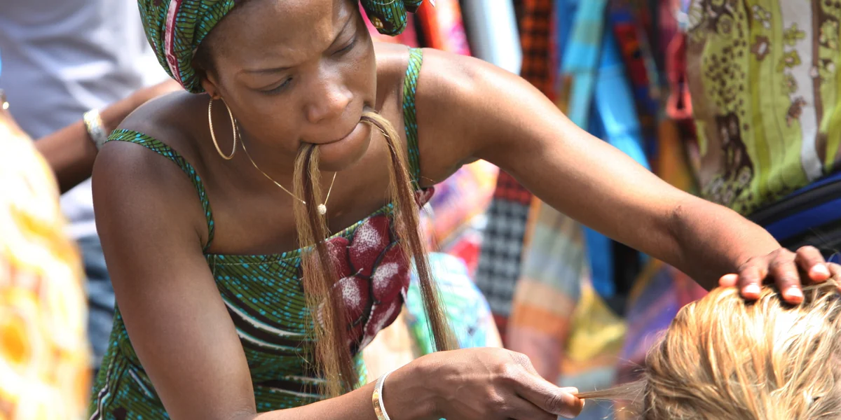 Mit ihrer wild gelockten Perücke mit blonden und roten Strähnchen setzt Vicky den Trend in ihrem Geschäft. „Echtes Haar aus Brasilien ist total angesagt“, lacht die junge Frau aus Kamerun und zieht mit ihren rosa Fingernägeln an ihren Korkenzieherlöckchen. „Es hält viel länger als die Haarteile aus Synthetik.“ Viele ihrer Kundinnen sparen über einen langen Zeitraum, um das Geld dann in ihrem Salon für echtes Haar zum Einnähen auszugeben.