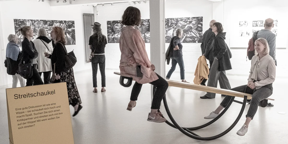 Auf einer „Streitschaukel“ etwa wippt man mit eine*r Partner*in und diskutiert dabei – und wer das stärkere Argument hat, ist jeweils unten. Auf der „Matte für Beweglichkeit“ kann man seine eigene Kritikhaltung erproben, um sie anschließend auf der „harten Bank der Theorie“ zu hinterfragen. Die „Kritikkanzel“ ist schließlich der Ort, für den man den meisten Mut aufbringen muss: Laut artikuliert man seine Kritik vor den anderen.