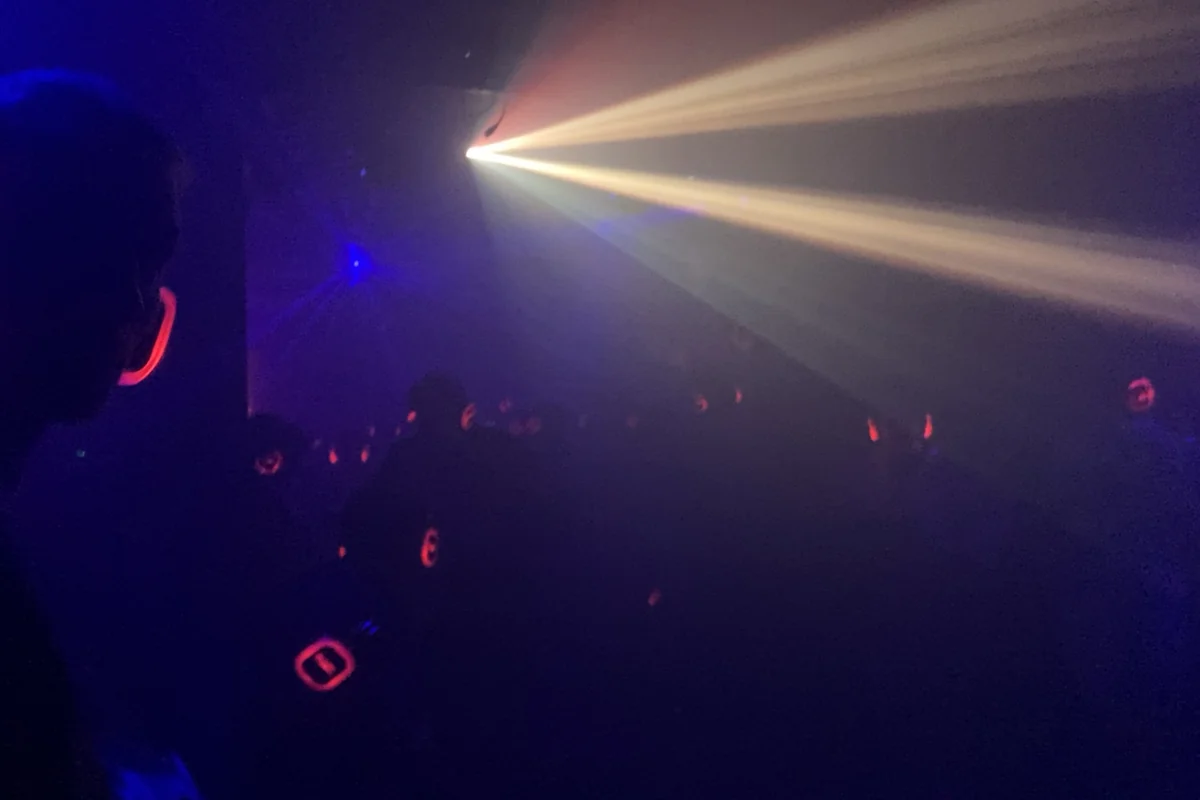 Das muss natürlich vorab gesagt werden. Falls jemand aufs Klo muss, bitte da hinter dem Vorhang. Und nicht zu lange, ihr wisst schon, es gibt nur zwei. Es gibt auch ein Awarenessteam. Die Leute am Tresen wissen Bescheid. Und jetzt müsst ihr die Kopfhörer aufsetzen. Kopfhörer? Silent Disco? Echt jetzt?