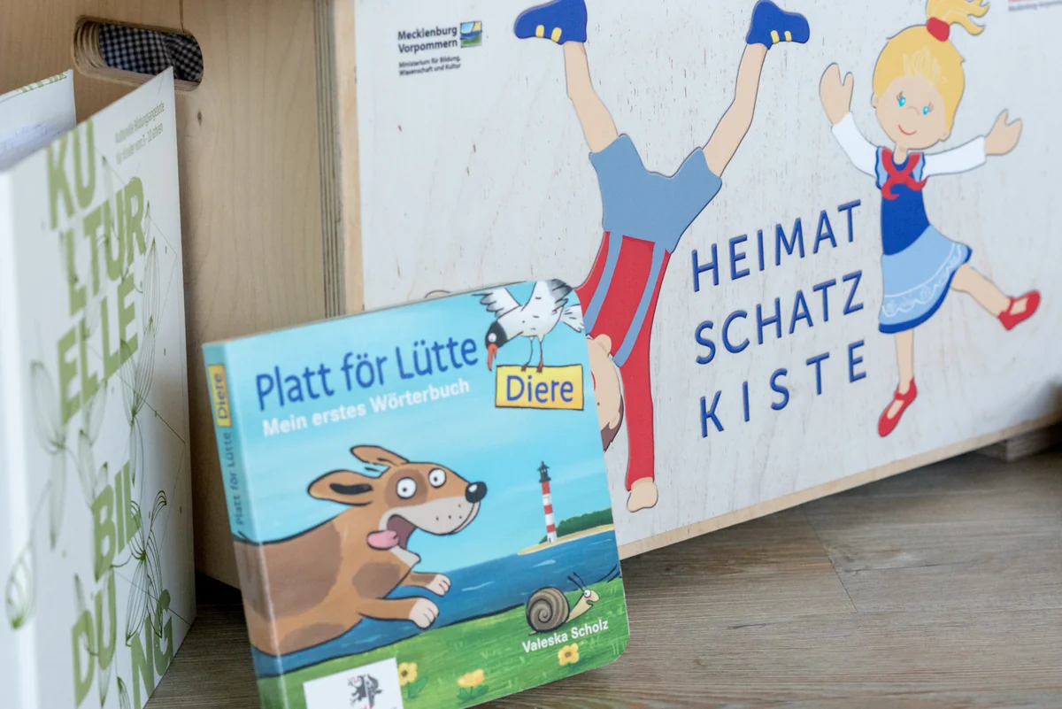 Schatzkiste: Die Kultur der Heimat sei ein Schatz. Deshalb hat sie dabei mitgemacht, Heimatschatzkisten an Kitas und Horte in Mecklenburg-Vorpommern zu schicken. 1.500 Stück – an jede Kita und jeden Hort ging eine. Die Holzkisten sind gefüllt mit Handpuppen, Büchern, Naturführern, einem Bernstein, einem Stück „Sternberger Kuchen“: Das ist ein über 23 Millionen Jahre altes Sandgestein, in dem zahlreiche Fossilreste eingelagert sind. Dazu sind Spiele, Anleitungen für Tänze und ein großer dicker Ordner mit didaktischen Handreichungen beigelegt. Die Kiste ist Teil eines Programms, das heimatkundliche Inhalte und die Vermittlung des Niederdeutschen fördert.