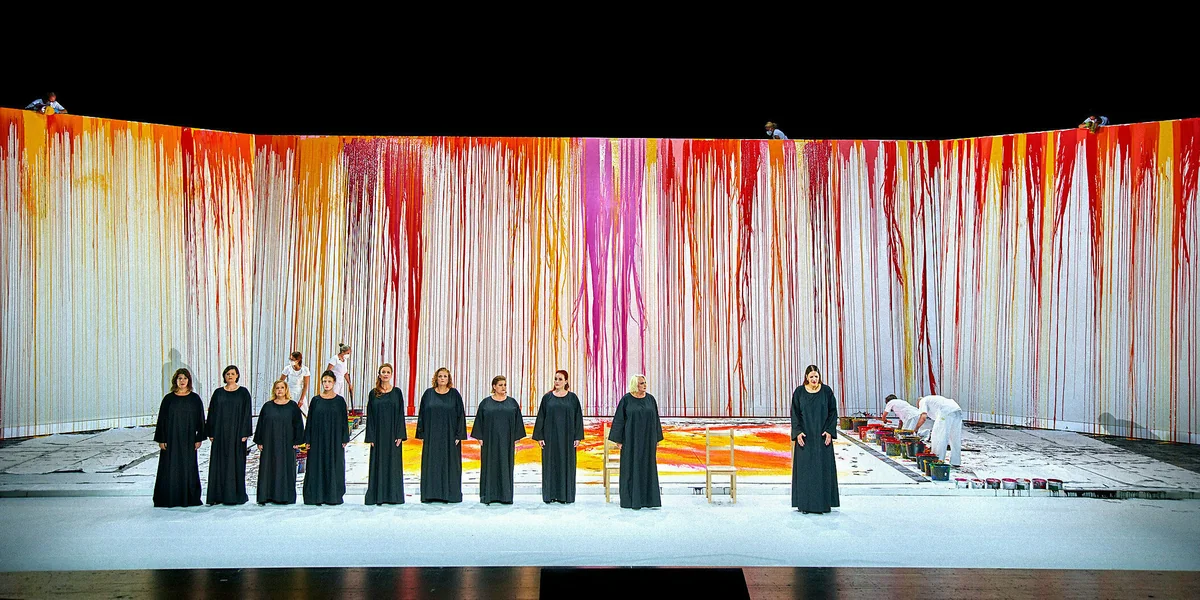 Zu Beginn ist die Bühne ein unschuldig weißer Raum, ein paar Besen stehen bereit und drei Stühle an der Rampe. Die Sänger*innen treten in einheitlichen schwarzen Kutten auf, und während der Dirigent Pietari Inkinen im gedeckelten Graben das Orchester zu ersten Klangstürmen aufpeitscht, beginnen zehn Maler*innen mit ihrer Arbeit: Eine Abordnung zelebriert die für Nitsch typischen sogenannten Schüttbilder, bei denen Farbe am oberen Rand der Leinwand ausgegossen wird und dann in Rinnsalen hinunterläuft.