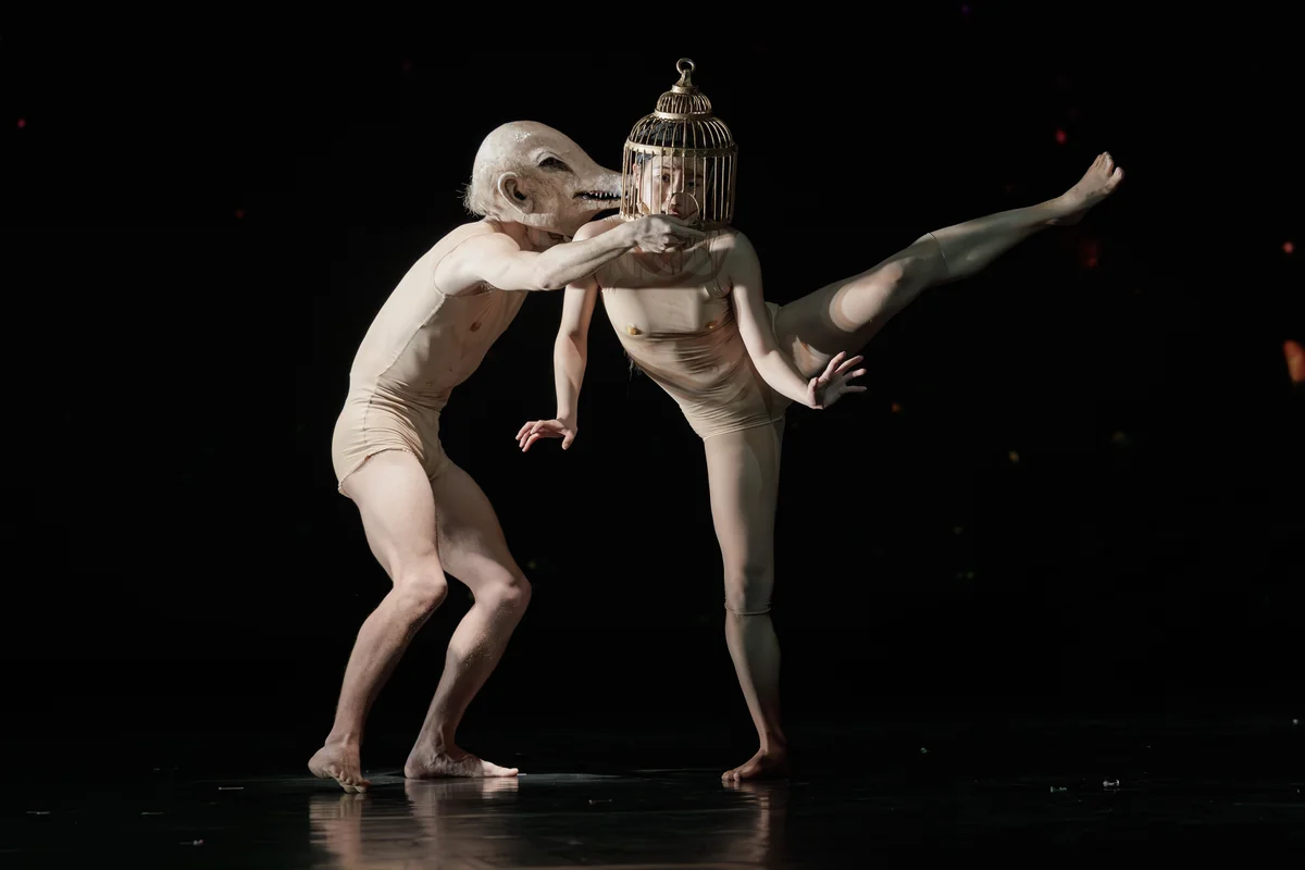 Zwischen den Zuschauer:innen tanzen in hautfarbenen Trikots entblößte Menschen mit aufgenähten Gummibrüsten. Alle wirken schmerzgepeinigt, von Qual gekrümmt und von Begehren getrieben. Der räkelige Verlockungsreigen mündet in einen zärtlichen Pas de deux – was wiederum ein aggressives schweinsköpfiges Wesen stört.