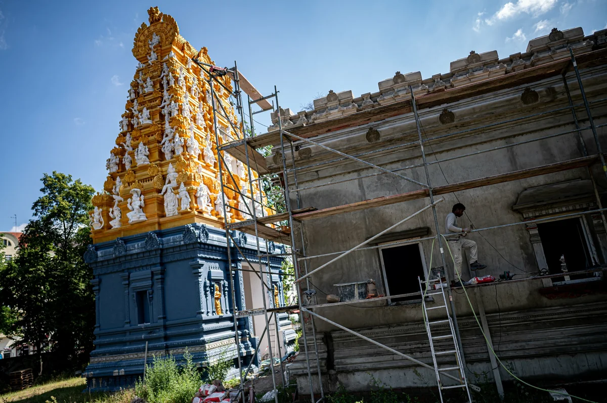 In diesem Sommer arbeiten hier sechs Tempelbauer, die zu finden, habe lange gedauert, sagt Krishnamurthy. Die Arbeiter brauchen eine Aufenthaltsgenehmigung und die nötigen Papiere. Auch die Coronapandemie habe den Bau des Tempels verzögert. In Pandemiezeiten habe niemand aus Indien nach Deutschland kommen wollen, erst im vergangenen Jahr habe sich die Lage entspannt und sie konnten wieder Leute für den Bau anwerben.