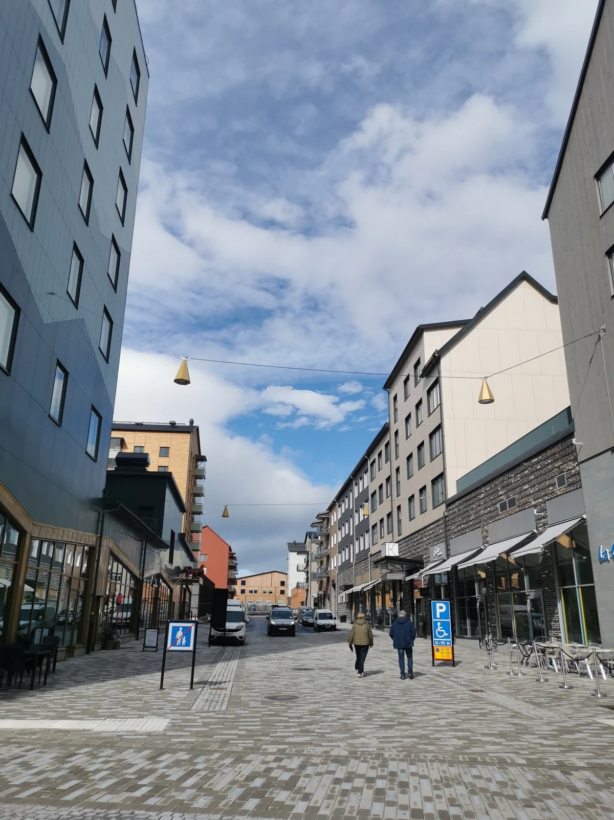 Von langgezogen kann tatsächlich nicht mehr die Rede sein. Wer jetzt von Süden nach Kiruna reinfährt, sieht eine Häuserzeile, die an Bekanntes erinnert – eine Variante nordischer Stadtansichten, schmale hohe Fassaden. Das Ganze geht aber nicht langsam in andere Gebäudearten über – da kommen ganz schnell offene Flächen.