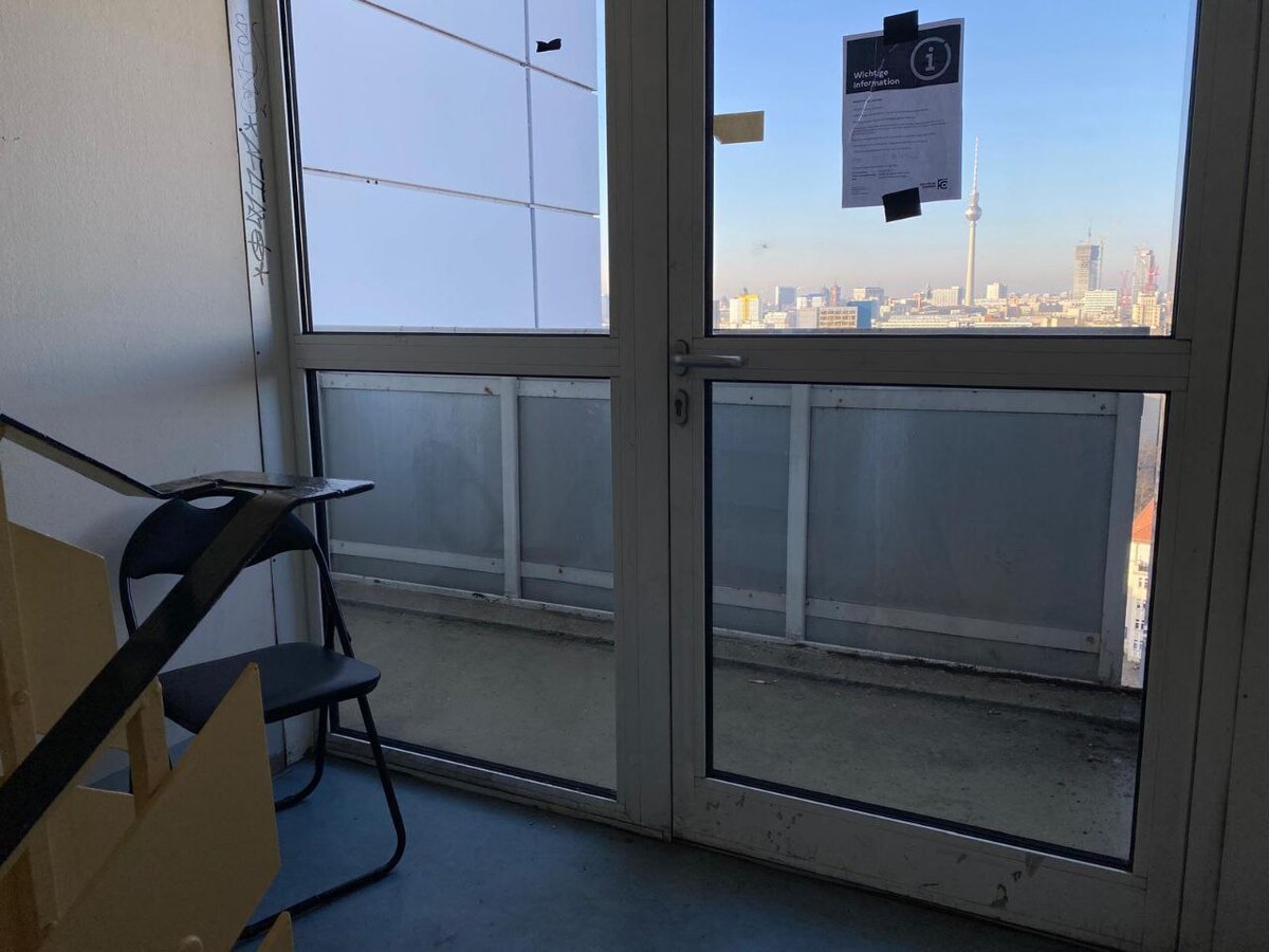 Was normalerweise mit dem Aufzug in wenigen Minuten möglich ist, wird über die Treppen stark in die Länge gezogen. Dafür bietet der Blick aus dem Treppenhaus eine mit jedem Stockwerk immer bessere Aussicht auf Berlins weiß-graue Betonlandschaft – inklusive Fernsehturm. Wie überall im Haus führt der Weg zu den Wohnungen über einen Balkon. Auf einem dieser Balkone steht Jannis*, in der 11. Etage. Seit 10 Jahren wohnt er hier. „Ich finde das unverschämt für die alten Menschen“, sagt er. Und seit die Aufzüge kaputt sind, würde noch nicht einmal mehr die Treppe gereinigt, fügt er hinzu.