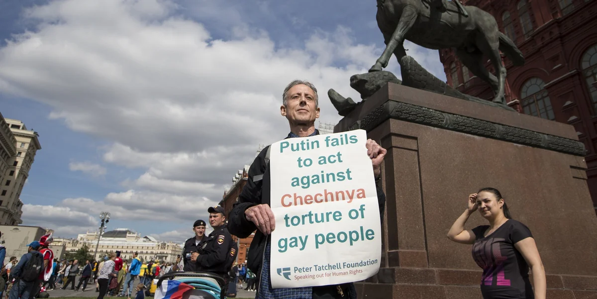Der britische LGBTI-Aktivist Peter Tatchell (66) wurde am Donnerstag kurz vor Beginn der WM auf dem Roten Platz in Moskau festgenommen. Zuvor hatte er ein Plakat mit der Aufschrift „Putin fails to act against Chechnya torture of gay people“ (Putin versäumt es, gegen die Folter homosexueller Menschen in Tschetschenien vorzugehen) hochgehalten und damit einige mediale Aufmerksamkeit erregen können, bevor der von mehreren russischen Polizeibeamten zu einen Wagen geleitetet worden war, der ihn zu einem Polizeirevier brachte.