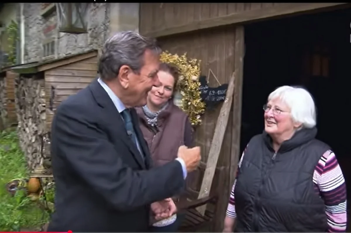 Ex-Kanzler Gerhard Schröder (SPD) steht in einem blauen Jackett und mit Ansteckmikrofon vor einem Gutshaus in Niedersachsen und unterhält sich mit zwei Anwohnerinnen: