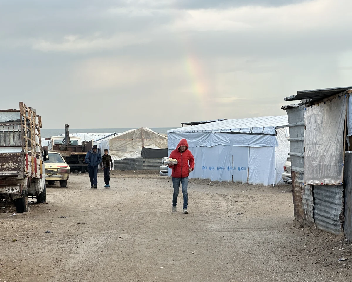 Der Mann mit der roten Daunenjacke, der zwischen den Zelten umhergeht: Mitten im Winter und während des Krieges versucht er, trotz der Zerstörung um ihn herum und des trüben Wetters, seinen Lebensunterhalt zu verdienen. Ich sah den Verkäufer schweigend gehen. Seine Schritte waren bestimmt und doch ruhig. Trotz der Kälte und des Regens scheute er sich vor keiner Herausforderung. Während er seine Waren mit sich trug, beobachteten ihn die Kinder aus den Zelten mit ihren großen und neugierigen Augen.