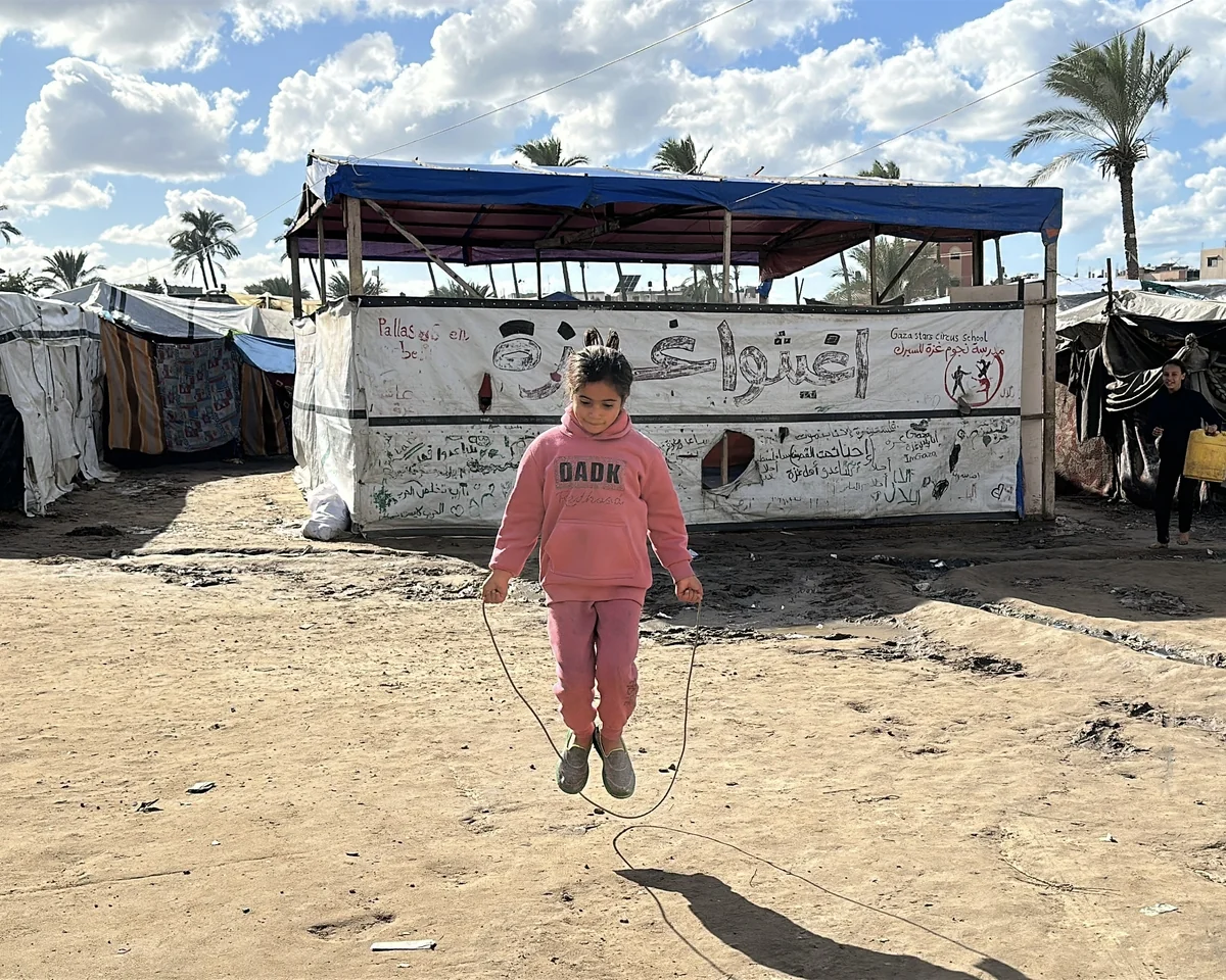 Das Lachen des Mädchens war wie ein Sonnenstrahl, der sich durch die Wolken kämpfte, die über ihr waren. Voller Energie sprang sie im gleichmäßigen Rhythmus, während im Hintergrund ein großer Schriftzug, „Rettet Gaza“, auf einem der Zelte zu lesen war. Ein Foto, das Unschuld und Leid zugleich zeigt und die Widersprüche dieser Welt, in der es nicht selbstverständlich ist, dass jedes Kind Sicherheit und ein Leben fern von Zerstörung und Tod verdient.