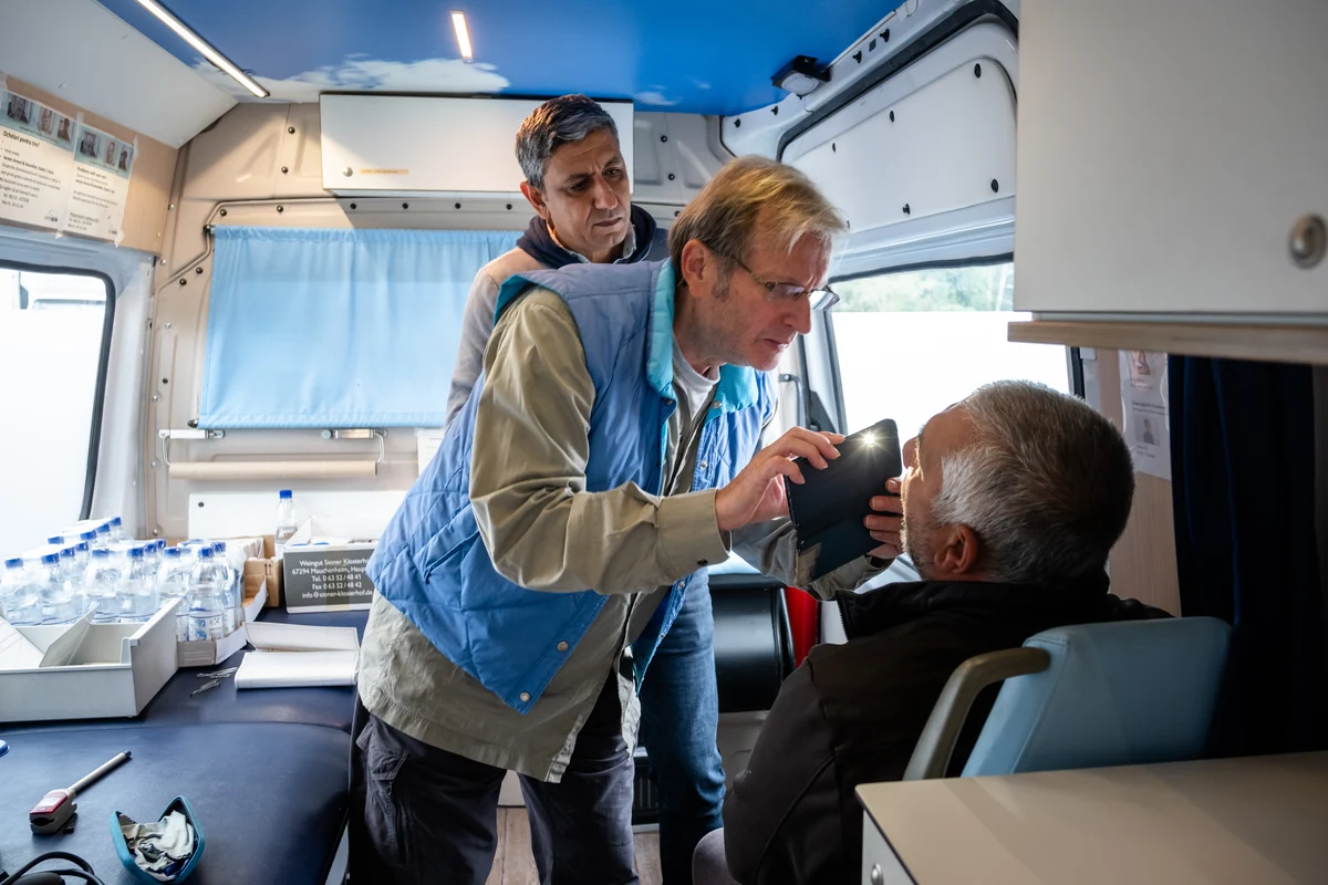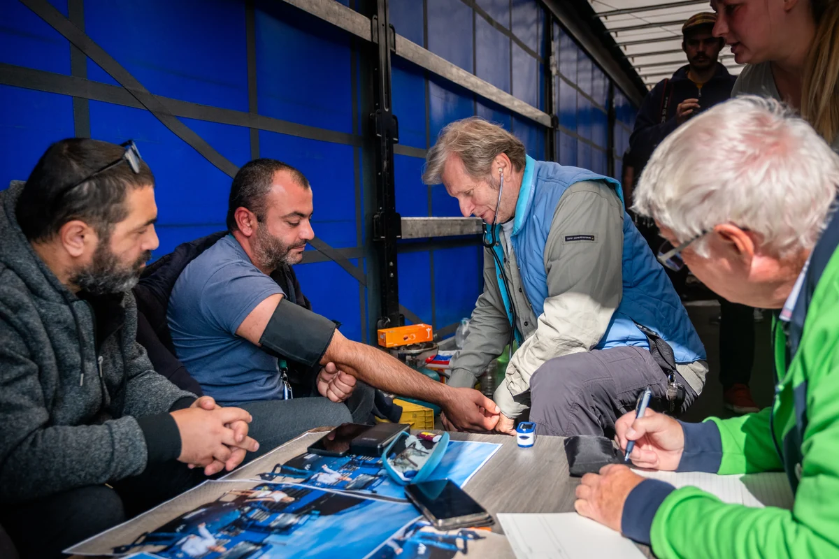 Gerhard Trabert und sein Team sind fertig mit den Untersuchungen. Anschließend geht es nach Gräfenhausen-Ost, auch dort sind ein paar Männer im Hungerstreik. Die werden direkt im Lastwagen untersucht, sitzen auf einer Matratze, während das medizinische Team ihre Werte prüft. Am Ende fasst Arzt Sebastian Schink zusammen: Die Männer hätten Kopfschmerzen, einen niedrigen Blutdruck und seien geschwächt, aber stabil. „Zum Glück ist niemand dabei, der ins Krankenhaus muss.“