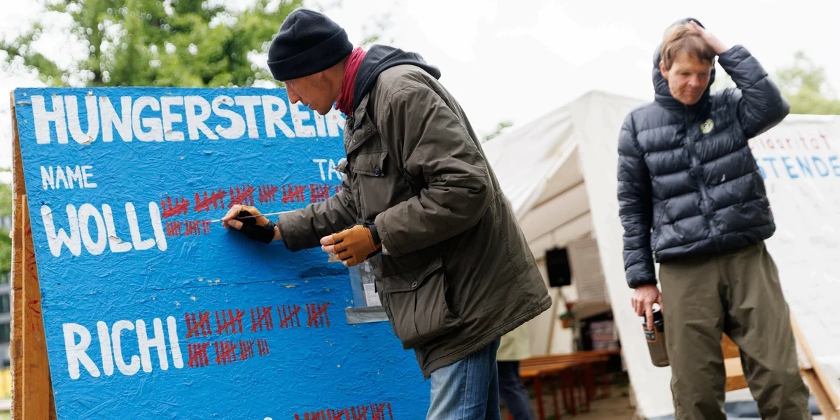 Ein Klimaaktivist der Gruppe „Hungern bis ihr ehrlich seid“ befindet sich in einem kritischen Gesundheitszustand. Der 61-jährige Michael Winter sei so untergewichtig, dass eine verantwortliche medizinische Begleitung nicht mehr zu gewährleisten sei, sagte die Ärztin Susanne Koch während einer Pressekonferenz der Aktivist*innen in Berlin. Sie ist Teil eines medizinischen Teams, das den Hungerstreik im dazugehörigen Protestcamp begleitet.