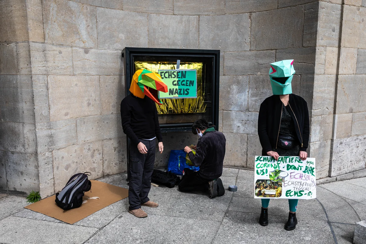 An einer Ampel auf dem Weg zum nahen Rosa-Luxemburg-Platz steht eine orientierungslose Gruppe von neun, in der Mehrzahl älteren Menschen neben ihren Fahrrädern. Auf den ersten Blick könnte man meinen, sie seien auf einer Fahrradtour. Sie schauen abwechselnd auf ihre Telefone, dann in der Gegend herum. Auf den zweiten Blick hat einer von ihnen, ein junger blonder Mann in Trekkinghose, schwedische Nationalflaggen an seinem Fahrrad und die neueste Ausgabe „Demokratischer Widerstand“ in der Hand – das wöchentliche Papier der Verschwörer:innen.