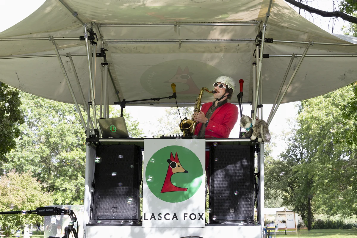 Sechs Stunden wird Lasca Fox die Parkbesucher:innen unterhalten. Er spielt abwechselnd Saxofon oder Keytar – das ist ein Keyboard zum Umhängen –, singt in ein Mikrofon und spricht in ein zweites die Ansagen ein. Weitere Instrumente hat er programmiert und auf dem Laptop dabei, per Knopfdruck bestimmt er, was wie lang zur Livemusik dazu gemischt wird. Als studierter Jazzmusiker weiß Lasca Fox zu improvisieren, und dieser Song darf jetzt gerne länger gehen, denn vor der Seifenblasenmaschine hat sich eine Menge Kinder versammelt. Die Eltern sehen fasziniert dabei zu, wie der Musiker fliegend die Rollen wechselt. „Irgendwie geht die Lichtshow nicht“, stellt dieser nun fest und klettert vom Podest, um die Kabel zu überprüfen.