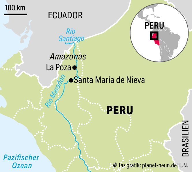 A n der Grenze zwischen Peru und Ecuador, am Fluss Santiago, da gibt es einen Ort, der anders ist als die übrigen Dörfer in der Region: La Poza. Er liegt im Amazonas, sechs Bootsstunden von der ecuadorianischen Grenze und zwei Reisetage von der Hauptstadt Lima entfernt. La Poza, umgeben von grünen Gebirgsketten und dichtem Regenwald, befindet sich im Territorium der indigenen Völker Wampis und Awajún.