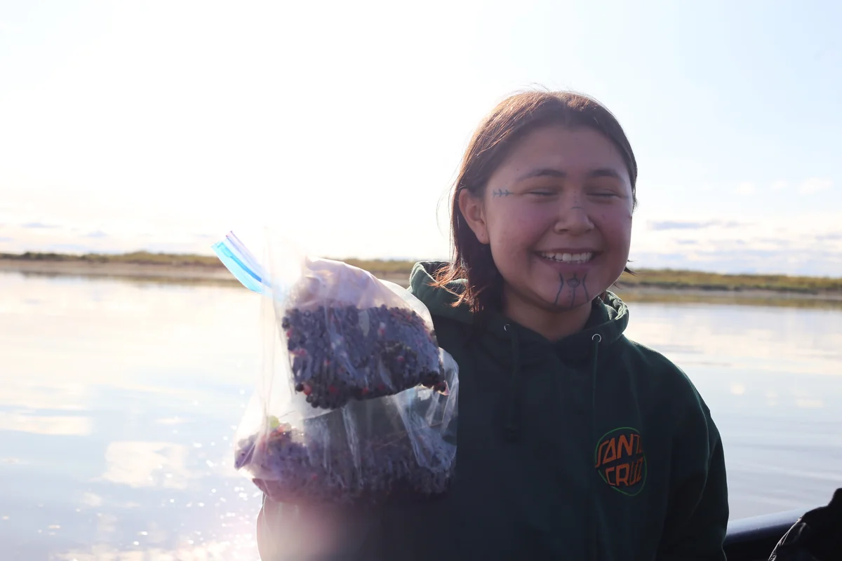 Am nächsten Tag packt das Paar Taschen mit Räucherlachs und getrocknetem Fleisch. Über den breiten Fluss geht es mit dem Motorboot nordwärts in die Jagdreviere der Iñupiat. Eine junge Frau mit traditionellen Tätowierungen im Gesicht fährt auch mit.