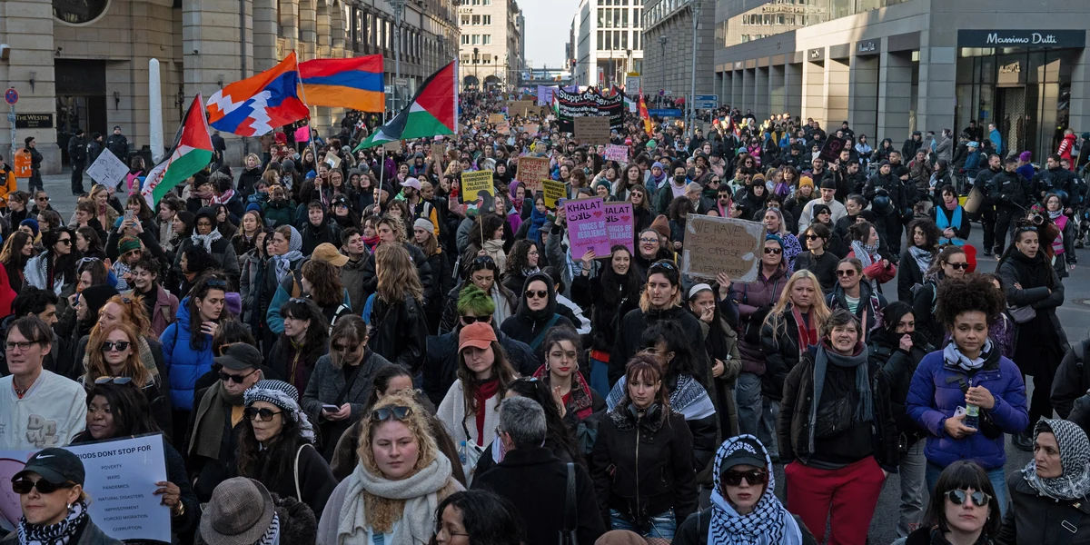 Der Himmel ist strahlend blau, Regenbogenfahnen wehen, auch Antifaflaggen sind zu sehen. Von der Bühne trällert das Lied „Supergirl“ unter reger Mitsingbeteiligung der Demonstrant*innen: „Sie ist stets bereit, Supergirl, schau was sie alles kann.“ Anlässlich des Internationalen Frauentags, der in Berlin ein Feiertag ist, hat ein Bündnis aus Gewerkschaften und Initiativen an diesem Freitag zu einer Demonstration vom Kreuzberger Oranienplatz zum Brandenburger Tor aufgerufen. Laut Veranstaltern sind es bei der Kundgebung am Ende 8.000 bis 10.000 Teilnehmende, die Polizei spricht von 4.500 Menschen.