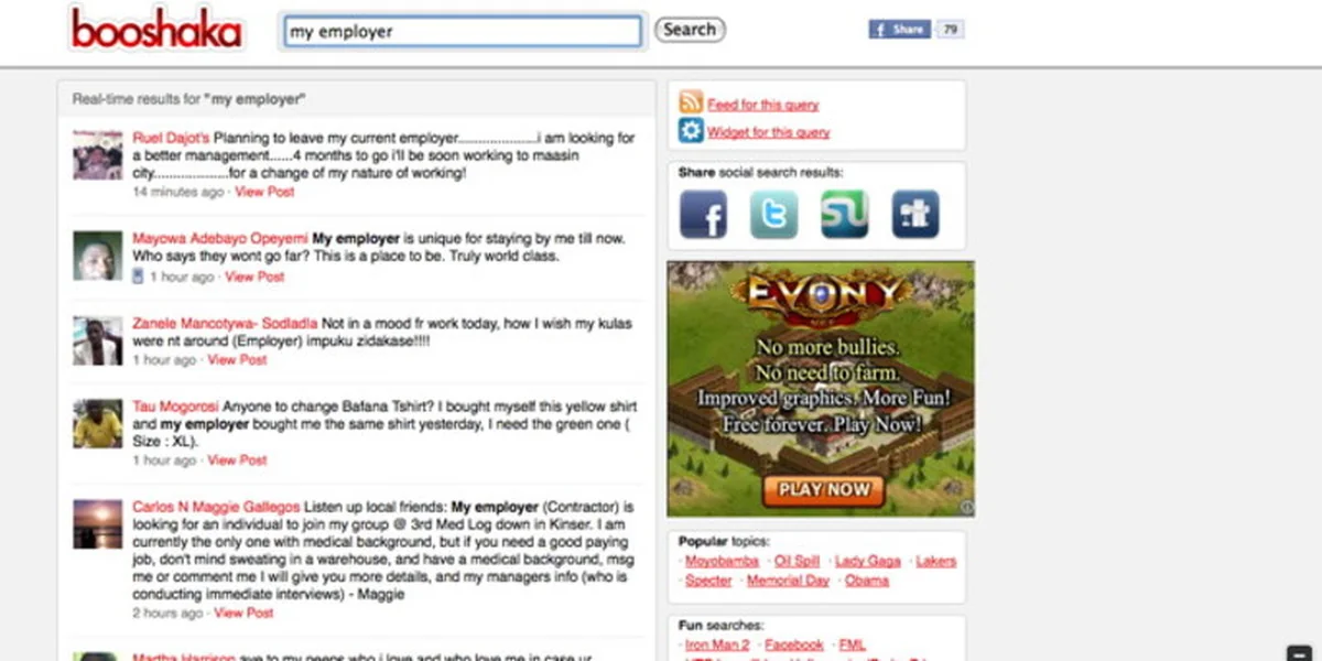Während Openbook also der Aufklärung dient, ist Booshaka wiederum offensichtlich als kommerzielles Projekt angedacht – inklusive Werbung, "populären Themen" und "lustigen Suchbegriffen". Das Angebot wird im Minutentakt aktualisiert. "Booshaka ist das, was passiert, wenn Facebook, Google und Twitter zusammen ein Baby bekommen", schreiben die Macher stolz in ihrem Blog.