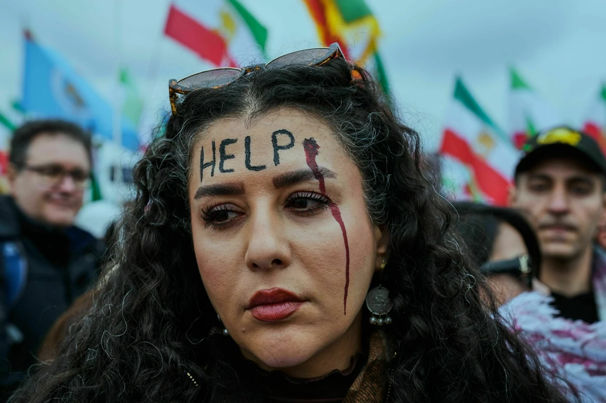 V alentinstag im Iran“ steht auf einem Schild, das ein Demonstrant mit auf die Münchner Theresienwiese mitgebracht hat, um gegen das Regime in Teheran zu protestieren. Darauf ist eine junge Iranerin zu sehen, die den Körper ihres Partners in einem schwarzen Leichensack umarmt. Er war – wie Tausende andere iranische Protestierende – bei den Aufständen im Januar erschossen worden.