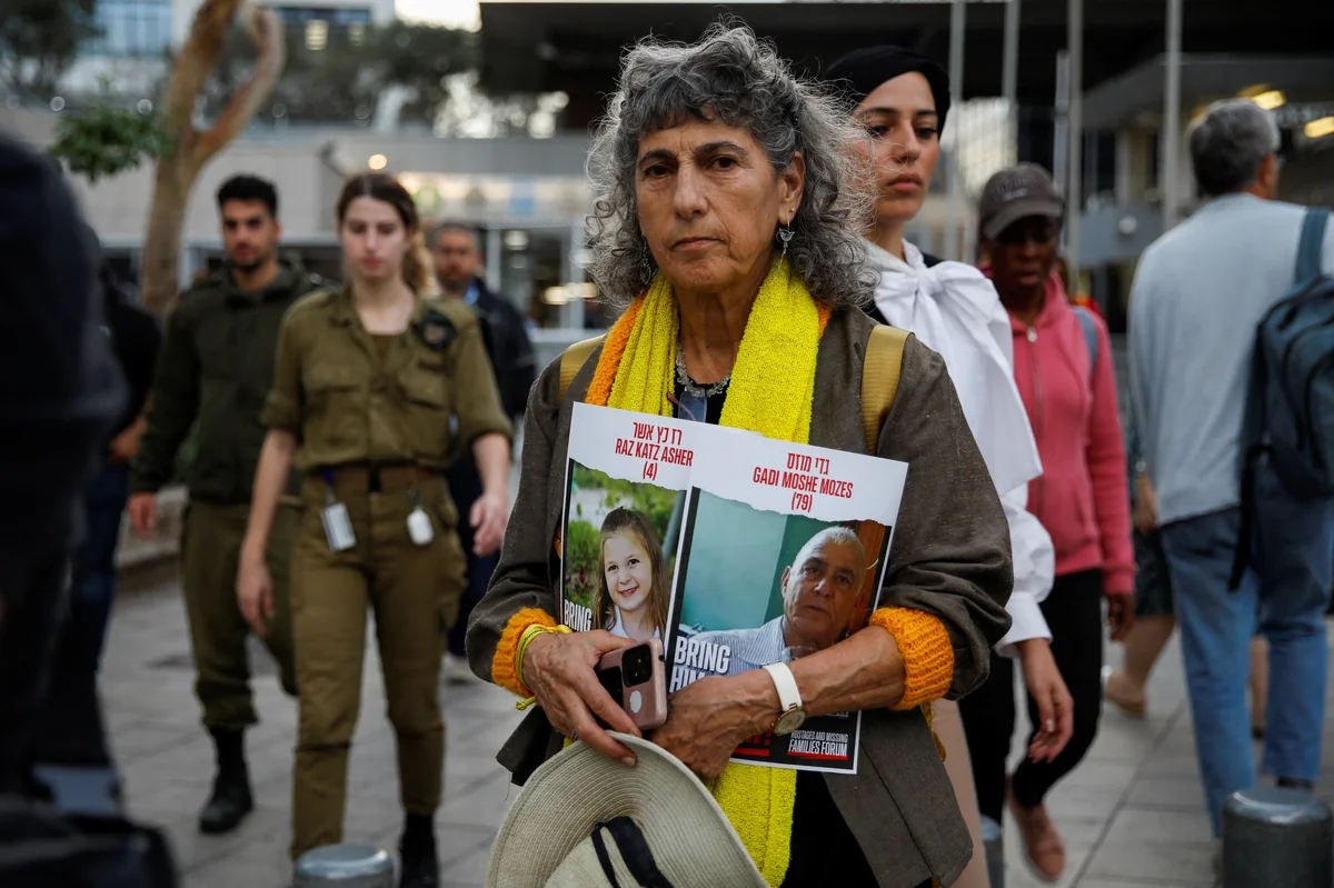 Die Terroristen ermordeten über 1.200 Zivilisten und verschleppten über 240 Menschen in den Gazastreifen. Darunter die Schwestern Dafna (15) und Ella (8) Elyakim. Ihre Tante Tagit Tzin zeigt wie andere Angehörige der Geiseln täglich Präsenz auf dem Vorplatz des Tel Aviv Museum of Art. Seit Wochen schläft sie dort in einem Zelt. Sie zeigt ein Video der Familie, das die Hamas über den Facebook-Account des ermordeten Vaters hochlud. Darin sind die beiden Mädchen mit gebrochenem Gesichtsausdruck in Gegenwart der Terroristen zu sehen. Beide tragen nach einer Weile nicht mehr dieselben Schlafanzüge wie zu Anfang.