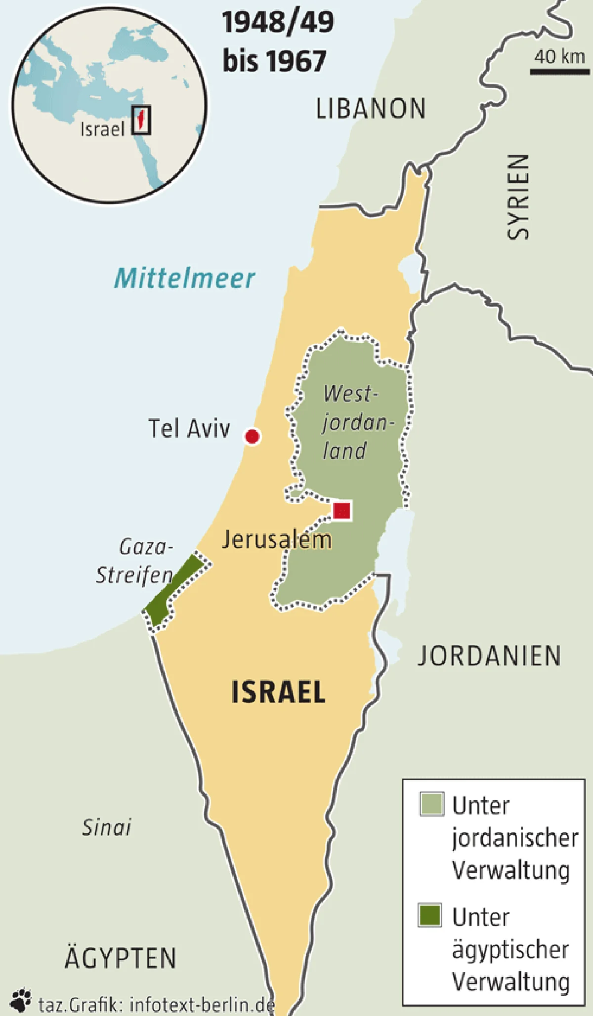 Am 5. Juni 1967 begann mit einem Präventivschlag Israels der Sechstagekrieg mit Ägypten, Jordanien und Syrien. Israel eroberte den Sinai, Teile der syrischen Golan-Höhen, das Westjordanland samt Ostjerusalem und den Gazastreifen. Für die arabischen Staaten war die Niederlage ein Schock. Für Israel war es ein wichtiger Sieg – mit Folgen bis zum heutigen Tag. Denn Teile der eroberten Gebiete hält Israel bis heute besetzt. Über eine Million Palästinenser gerieten damals unter die Besetzung, Hunderttausende flohen.