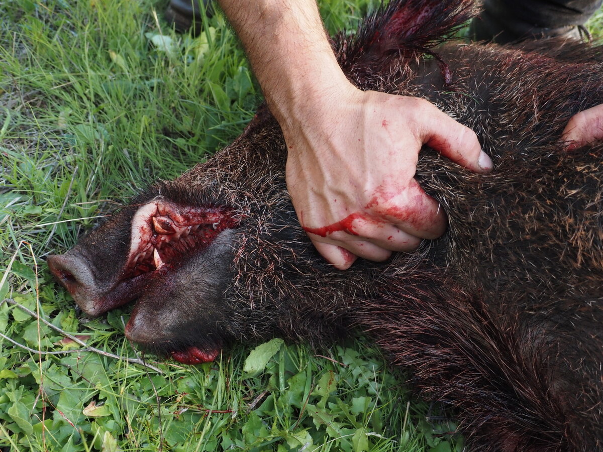 Plötzlich kommt das Wildschwein aus dem Busch heraus. Seine Läufe bewegen sich noch, doch es wurde getroffen. Wieder empfinde ich Mitleid. Das Blut fließt, irgendwann bewegt sich das Tier nicht mehr. Weil die Straße etwas abschüssig ist, rutscht das Wildschwein nach unten. „Hilf mir“, sagt der Schütze. „Wenn es nach unten rutscht, wird es schwierig, es wieder nach oben zu bringen.“