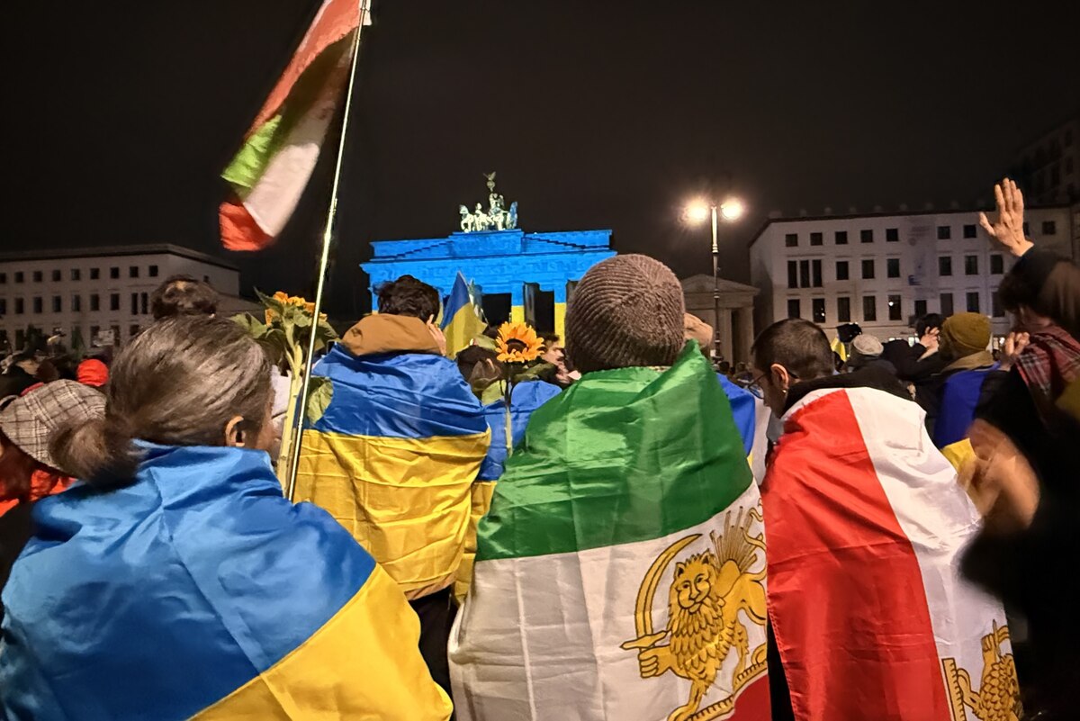 D er Höhepunkt ist ein Moment der Stille. 5.000 Menschen knien am Dienstag vor dem Brandenburger Tor nieder und gedenken der Opfer des russischen Krieges in der Ukraine. Dann stehen sie auf und klatschen. Viele schwenken ukrainische Flaggen in den Farben Blau-Gelb, andere tragen iranische und belarussische Symbole. Berlin zeigt sich an diesem Abend solidarisch mit denen, die für ihre Freiheit kämpfen.
