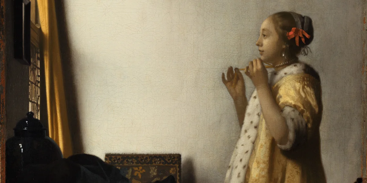 Gegen ihre weibliche Vertikalität, die so fest im Boden verankert scheint, stehen in der unteren Hälfte des Bilds die scharfe horizontale Kante eines Tischs und ein leerer Stuhl, die so eine visuelle Barriere bilden, die den Maler und uns Betrachter von dem trennen, was wir sehen. Das ist ein wiederkehrendes Motiv bei Vermeer, der Stühle, Tische und schließlich sogar sich selbst in seinem Bild „Die Malkunst“ im Vordergrund platziert, um uns auf Distanz zu halten zu dem, was wir sehen und vielleicht begehren. Der Künstler dringt in die Privatheit seiner Figur mit der Perlenkette ein, und doch ist sie vollständig – getrennt und außerhalb seines Zugriffs.