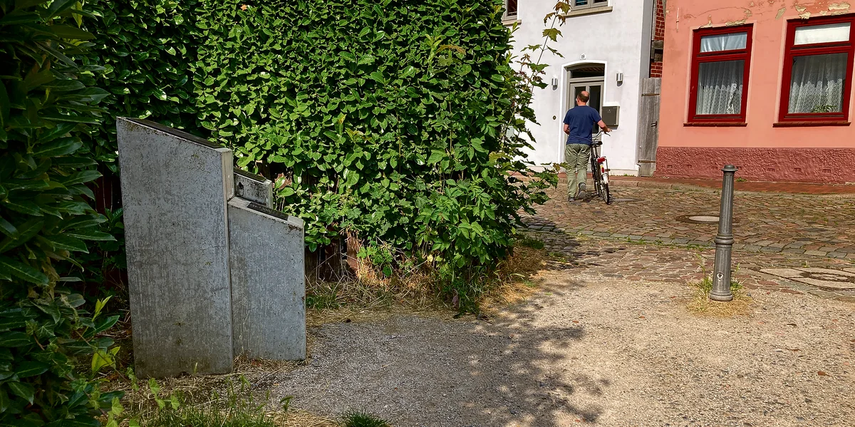 Ein merkwürdiges Eckchen, das. Aber vielleicht muss es das auch sein, weil ja die Idee dieses John-Lennon-Denkmals in Verden selbst immer schon merkwürdig war: Wer vom wuchtigen Dom die kopfsteingepflasterte Mühlentor-Straße runterkommt und dann rechts in den geschotterten, schmalen Pfad Am Bollwerk einbiegt, ist fast schon dran vorbei gelaufen.