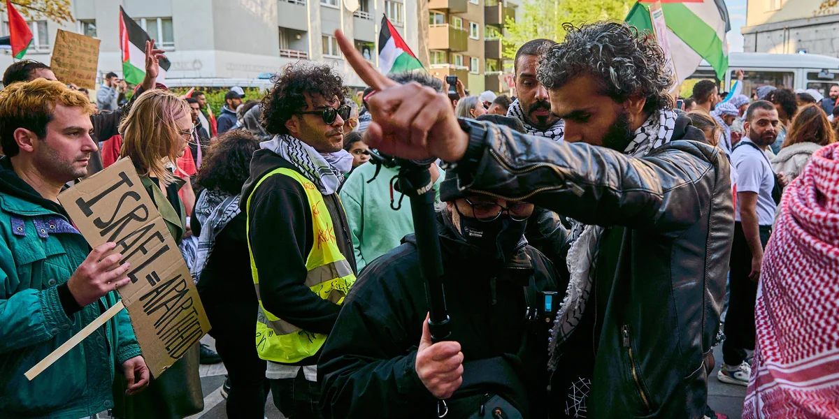 Vom Lautsprecherwagen wurde zum gewaltsamen Aufstand aufgerufen. „Intifada bis zum Sieg“, hörte man auf den Straßen. Neben Fahnen der PFLP-nahen Gruppe Samidoun, die seit vergangenem März in Israel als Terrororganisation eingestuft wird, marschierten munter Genossinnen und Genossen der Linksjugend solid. Wie der Tagesspiegel berichtete, befand sich im Protestzug auch eine Gruppe Jugendlicher aus der arabischen Community, „die immer wieder Parolen der Terrororganisation Hamas anstimmten“.
