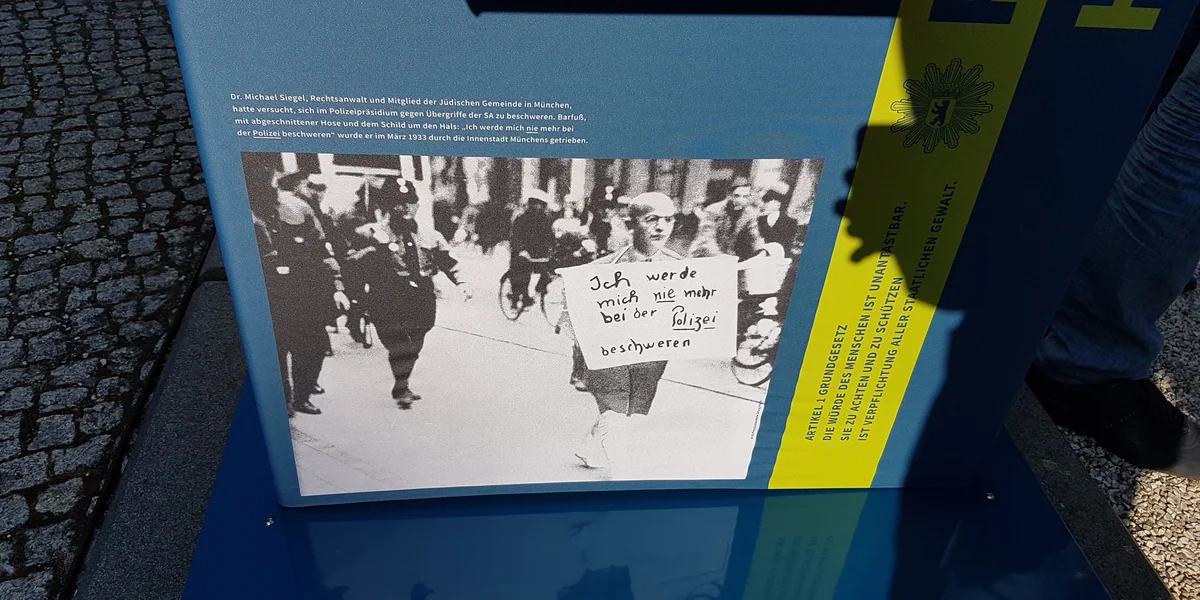 Ausgangspunkt war, dass sich die Berliner Polizei mit einem eigenen Beitrag am Jubiläumsjahr „1.700 Jahre Jüdisches Leben in Deutschland“ beteiligen wollte. Das Konzept ausgearbeitet haben maßgeblich Polizeinachwuchskräfte. Von der Nazizeit, in der der damalige Berliner Polizeipräsident 1938 insgesamt 76 Richtlinen erließ, um die jüdische Bevölkerung beim Vorsprechen bei der Polizei zu schikanieren, spannt sich der Bogen bis heute zu rechtsextremistischen und antisemitischen Vorfällen, auch innerhalb der Polizei. Sieben Stelltafeln gibt es.