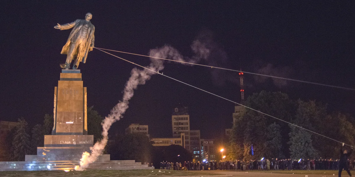 Die Behörden der russischsprachigen Stadt mit 1,5 Millionen Einwohnern hatten die Entfernung der Lenin-Statue bereits zugesagt, den Vollzug wollten die Aktivisten aber offenkundig nicht abwarten. Einige nahmen Bruchstücke des Denkmals als Andenken mit nach Hause. Die wegen des Verdachts auf Sachbeschädigung eingeleiteten Ermittlungen wurden am Sonntag eingestellt, da laut dem Innenministerium niemand bei der Protestaktion zu Schaden kam.