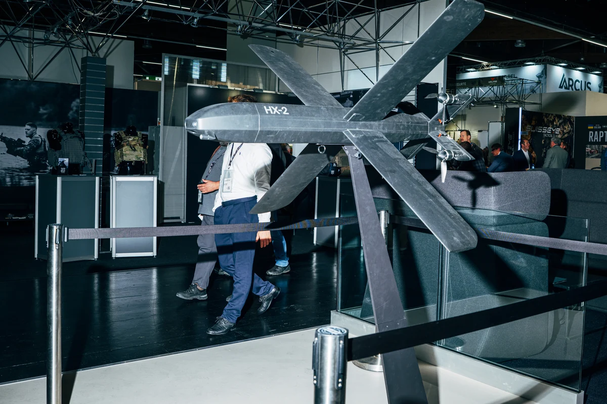 Das Münchner Start-up Helsing präsentiert sich in Nürnberg pompöser als sein Berliner Konkurrent Stark Defence. Auf einem kleinen Podest sind Tische und Stühle aufgebaut, es gibt Gebäck und Kaffee aus der Maschine. Zentral ausgestellt und hinter Absperrband: die Angriffsdrohne HX-2. Sie ist halb so groß wie die von Stark und in mattem Schwarz gehalten.
